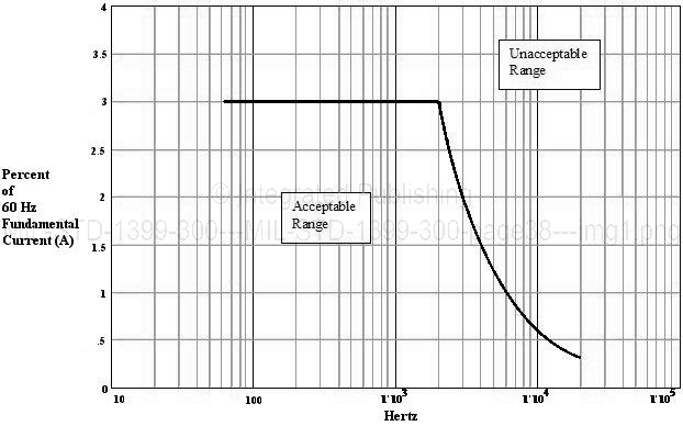 2000 Hz through 20 kHz shall not exceed the limit line set at 6000/f percent of the user equipment's full load fundamental current, where f is the nominal frequency. This is shown in Figure 17. User equipment, for the purposes of this requirement, shall be defined as a system with a standalone unit or the aggregate of a system with
