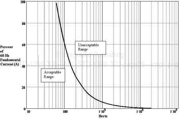 5.2.9.2 60 Hz user equipment less than 1 kVA. The operation of user equipment with power ratings < 1 kVA shall be current amplitude limited so that no individual harmonic line current or current of any frequency above the fundamental at 60 Hz to 20 kHz shall exceed the limit line set at a magnitude of 6000/f percent of the user equipment's full load fundamental current where f is the frequency. This is shown in Figure 18.